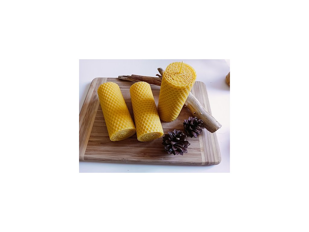 Svíce tvořená vrstvením mezistěn ze 100% včelího vosku doplněné bavlněným knotem české výroby.