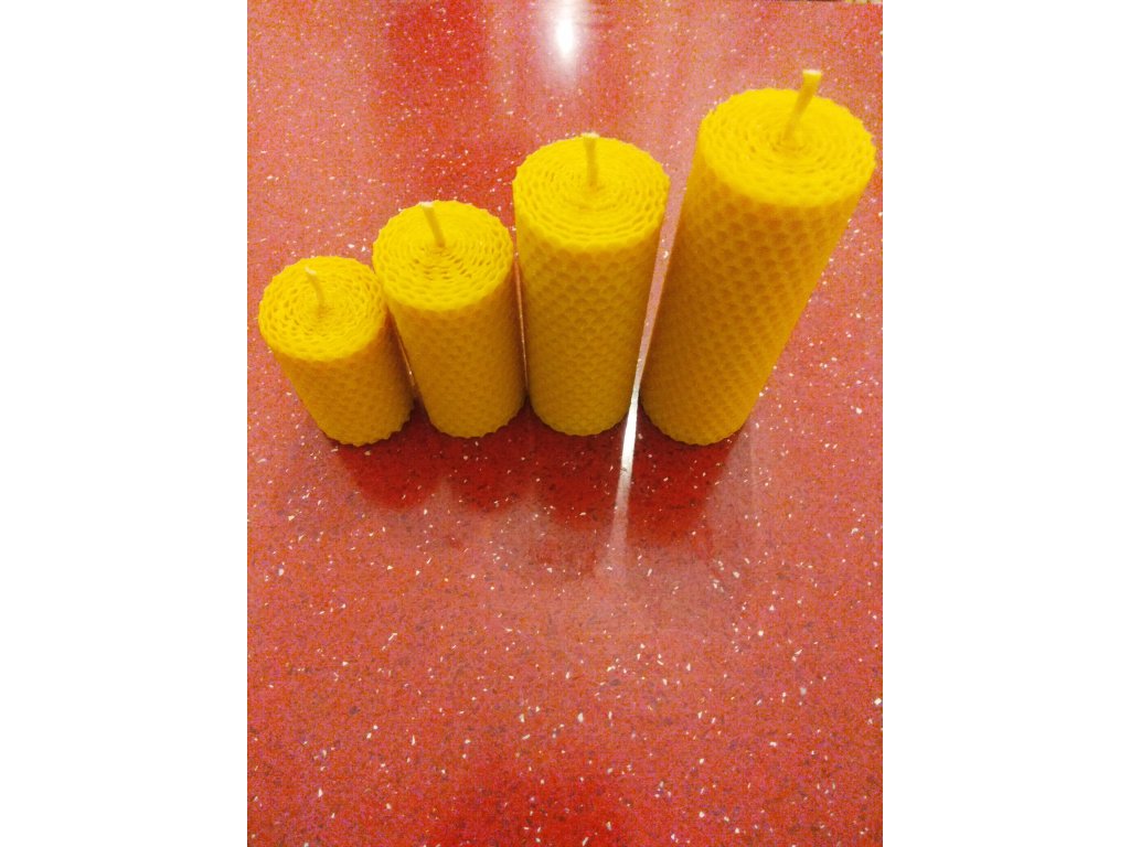 Čtyři svíčky z medového včelího vosku, každá motaná z mezistěn, čeká na svůj týden.