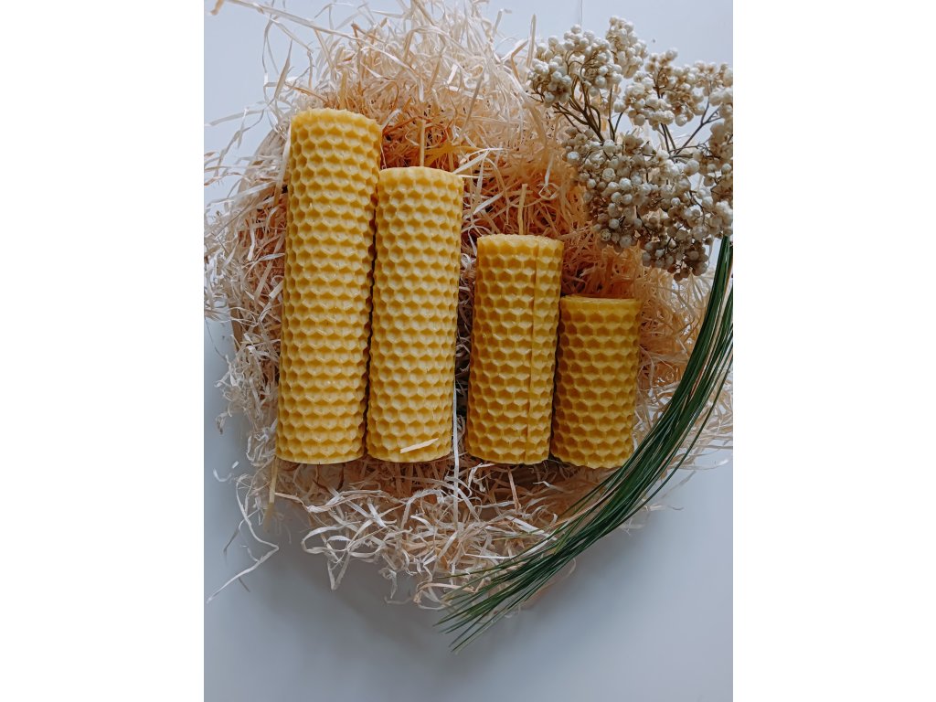 Svíce tvořená vrstvením mezistěn ze 100% včelího vosku doplněné bavlněným knotem české výroby.