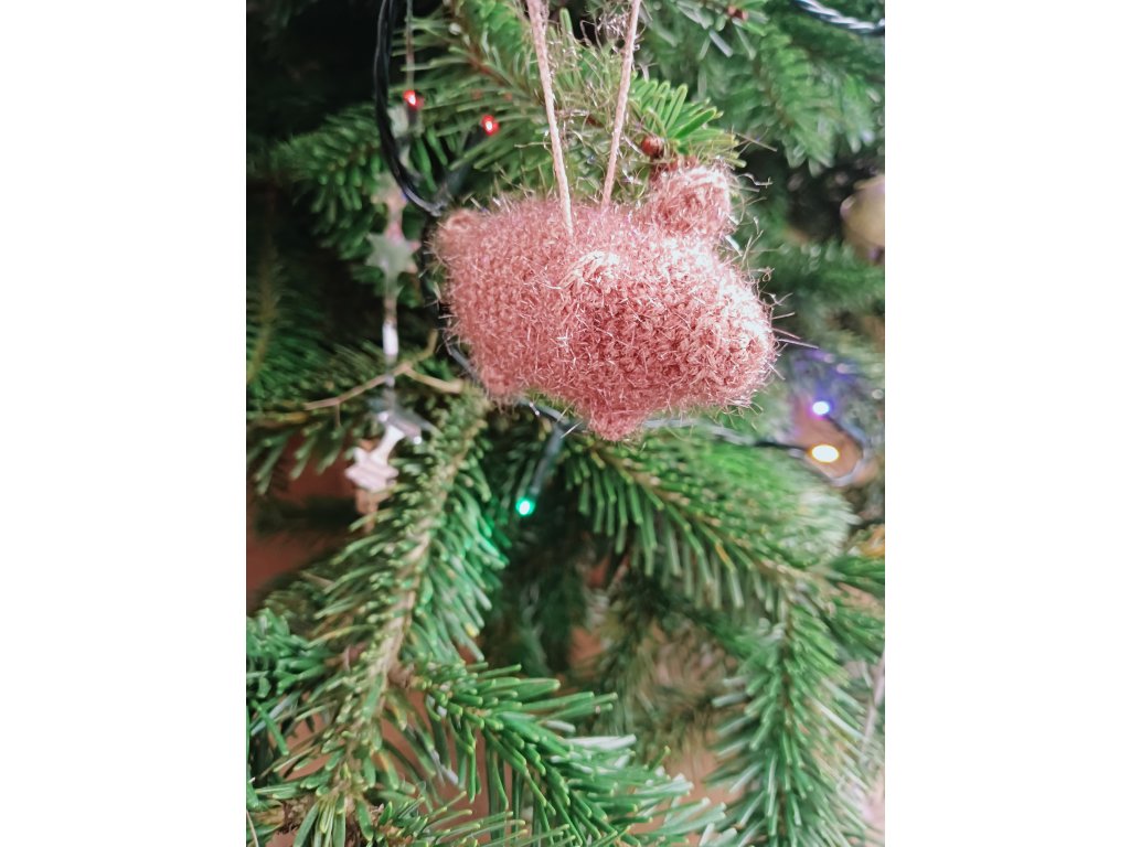 Háčkovaná vánoční ozdoba v podobě zlatého prasátka.