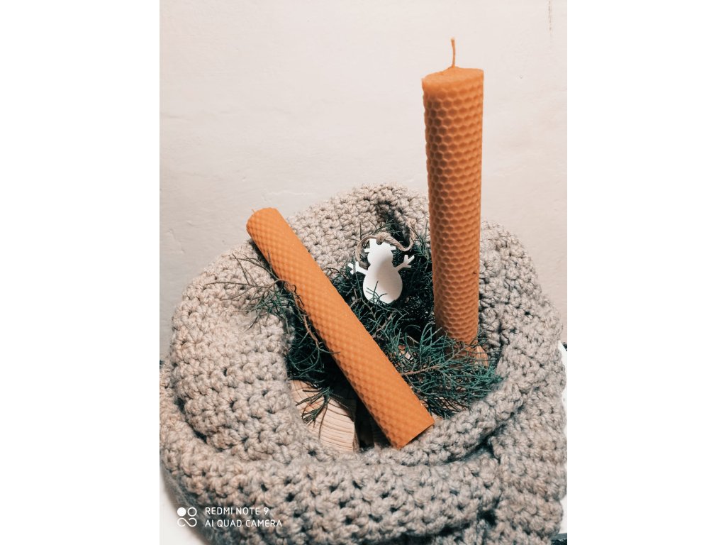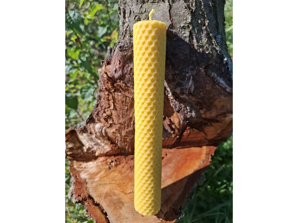 Tato svíce je ručně umotaná z mezistěny ze včelího vosku - jako by ji objímaly samy včely.