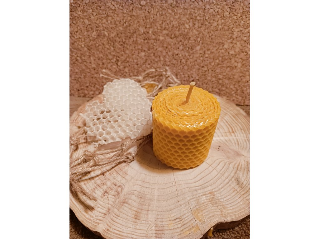 Tato svíce je ručně umotaná z mezistěny ze včelího vosku.