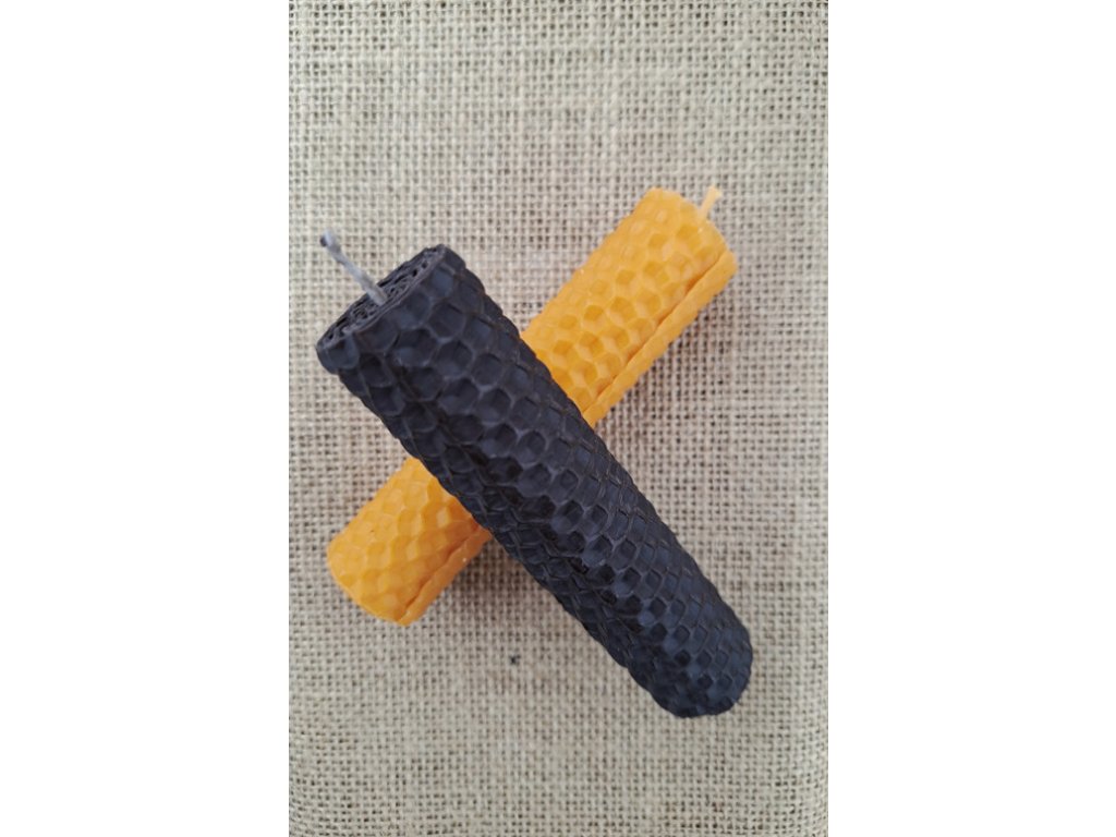 Tato svíce je ručně umotaná z barvené mezistěny ze včelího vosku.